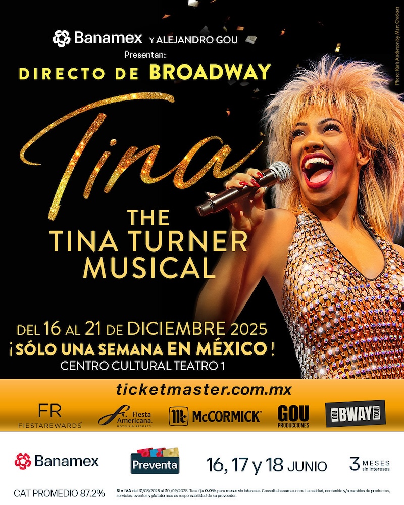 El poderoso y electrizante musical de Broadway que ha conquistado al público en todo el mundo, "TINA – The Tina Turner Musical", llega por primera vez a la Ciudad de México del 16 al 21 de diciembre en el Centro Cultural Teatro 1, como parte de su gira internacional. La presentación de esta aclamada obra en nuestro país es posible gracias al productor Alejandro Gou, quien continúa consolidando su compromiso por traer lo mejor del teatro musical global al público mexicano.